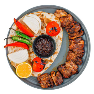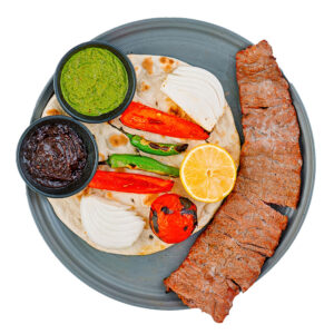 سیخ 250 گرمی گوشت مخلوط گوسفند و گوساله همراه با گوجه ، لیمو ، سبزیجات کبابی و سس ریحان