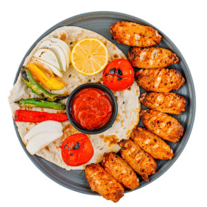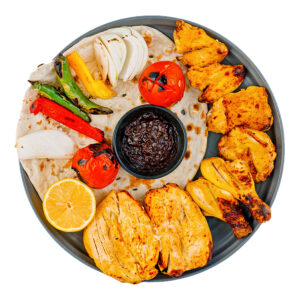 350 گرم فیله مرغ مزه دارشده با ماست و ادویه همراه با گوجه، لیمو، سبزیجات کبابی و سس ناردونی