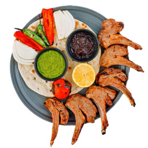 500 گرم راسته با استخوان گوسفندی همراه با مرینت مخصوص همراه با گوجه ، لیمو ، سبزیجات کبابی و سس ریحان